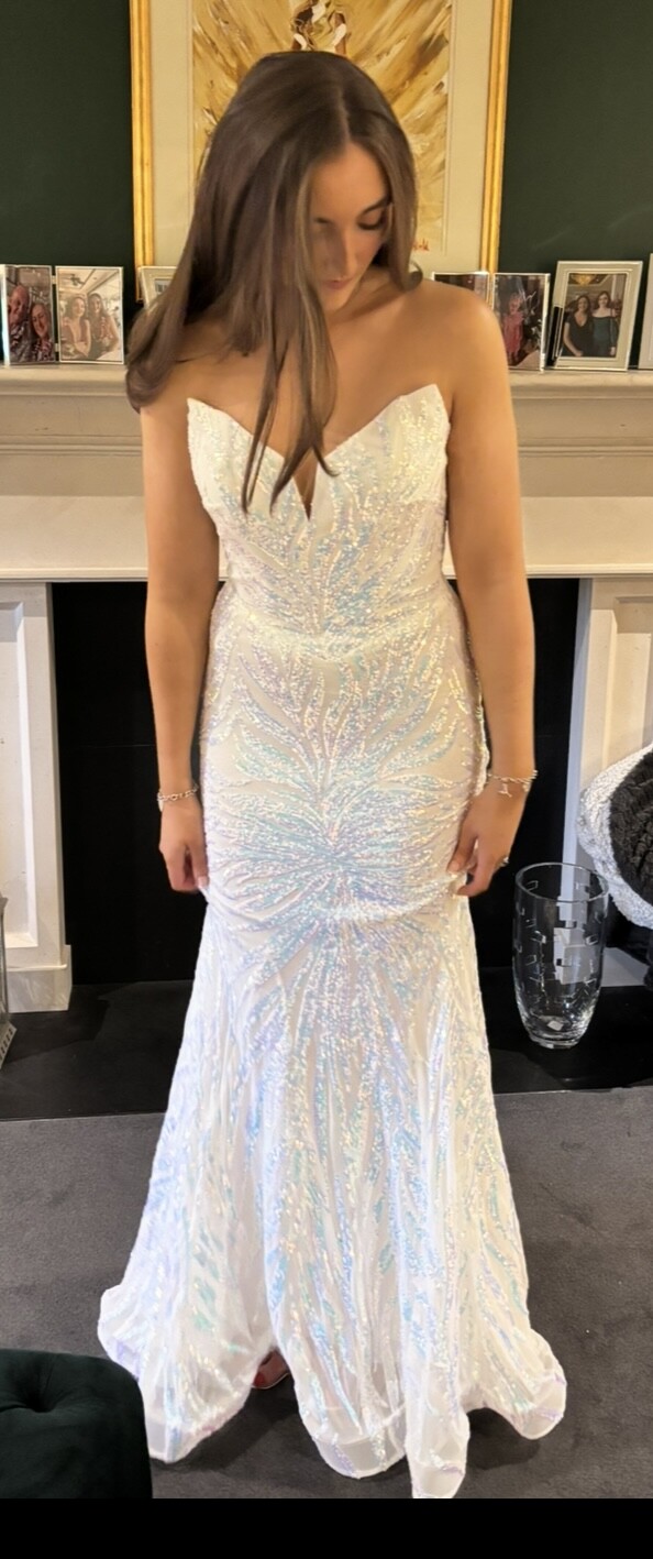 White sequinned fish tail style strapless floor length gown with highlights of blue and pink sequins.